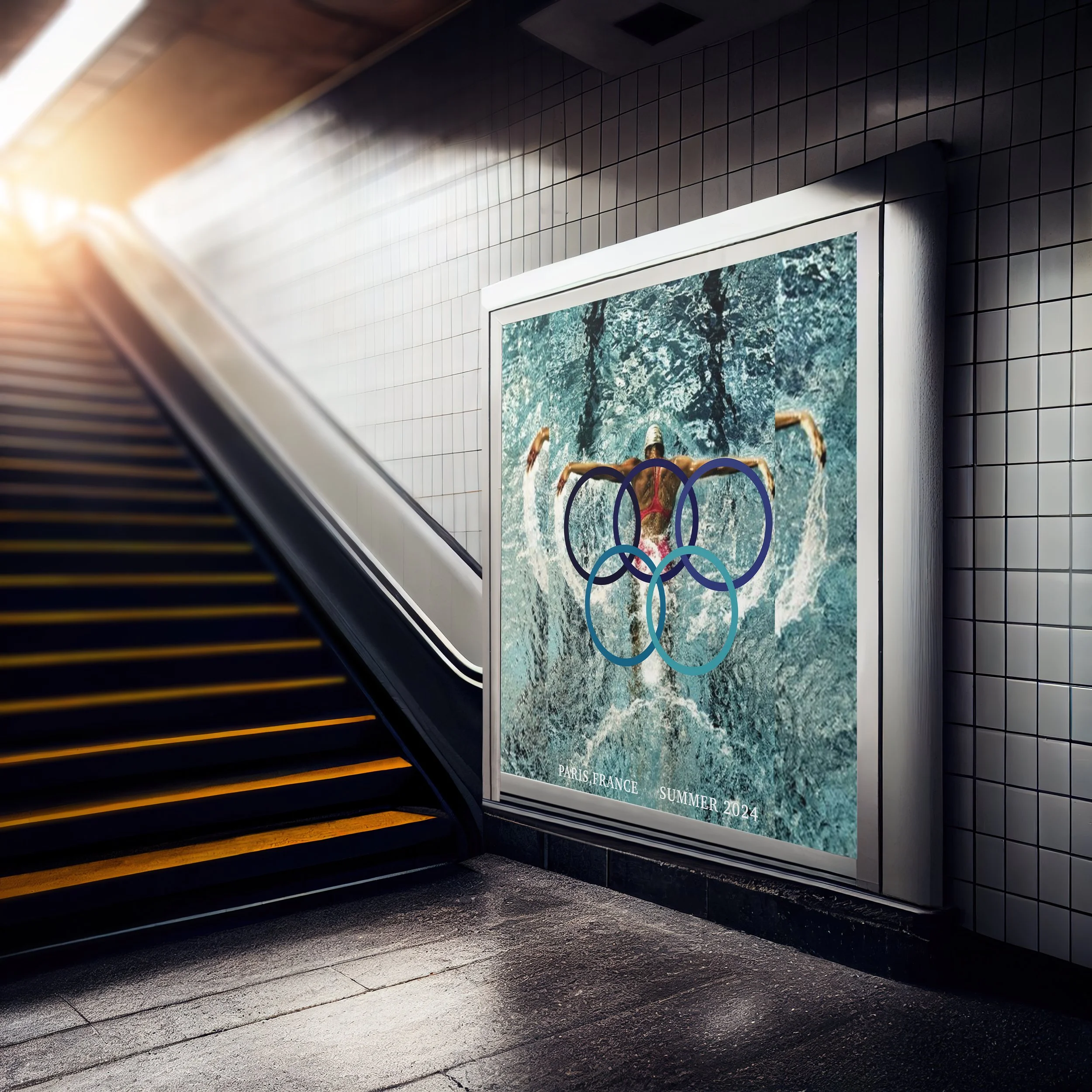 Influenced by the upcoming Olympics, I created a billboard design, using Adobe InDesign and Photoshop. This project captures the dynamic energy and spirit of the Olympic Games through a powerful and visually striking image of a swimmer performing the butterfly stroke. The central focus of the billboard is an athlete mid-stroke, illustrating the strength and grace of competitive swimming. In a creative twist, the water splashes from her stroke seamlessly outline the form of the Olympic rings, intertwining the symbolism of the Games with the athlete's movement. In InDesign, I focused on creating a clean and impactful layout that ensures the swimmer and the Olympic rings are the focal points.