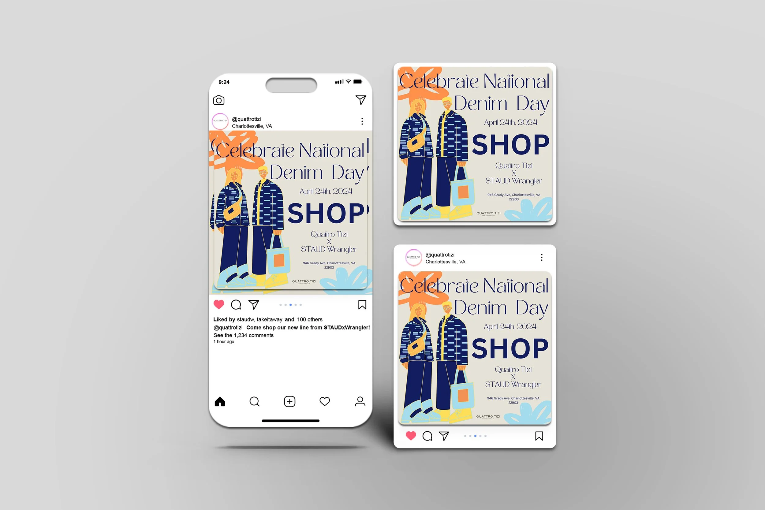 Though the clothing store already carries STAUD items, I sought to elevate awareness and anticipation for an upcoming pop-up event through the creation of a captivating Instagram graphic. This graphic not only serves to promote the event but also commemorates the spirit of National Denim Day, inviting followers to partake in the celebration of denim culture and style.