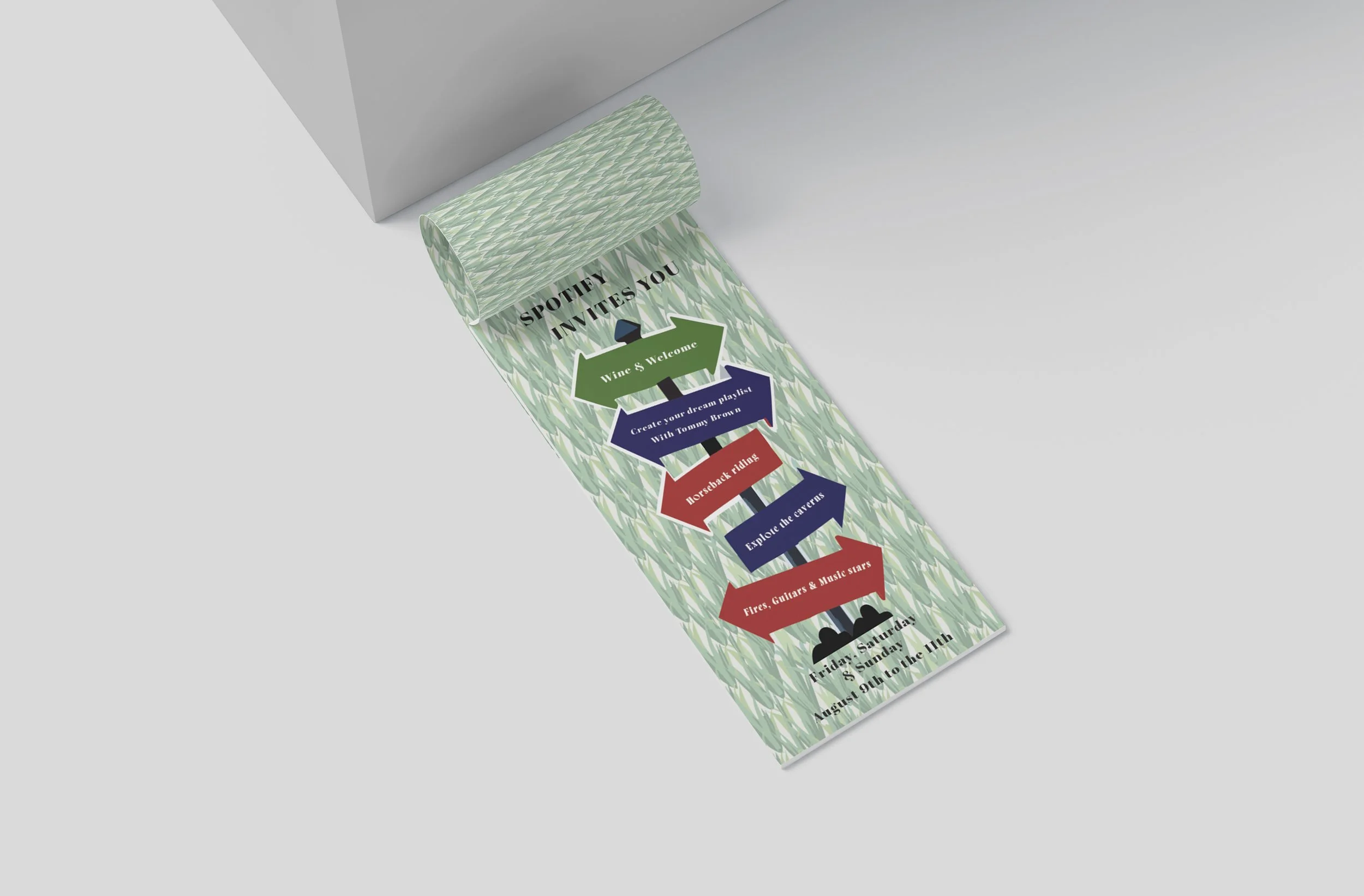 To merge these two passions, I designed an invitation for a Spotify retreat, featuring live music, opportunities to meet musicians, and a variety of engaging activities. The goal was to incorporate beautiful imagery, dynamic shapes, and striking typography to showcase my design skills.