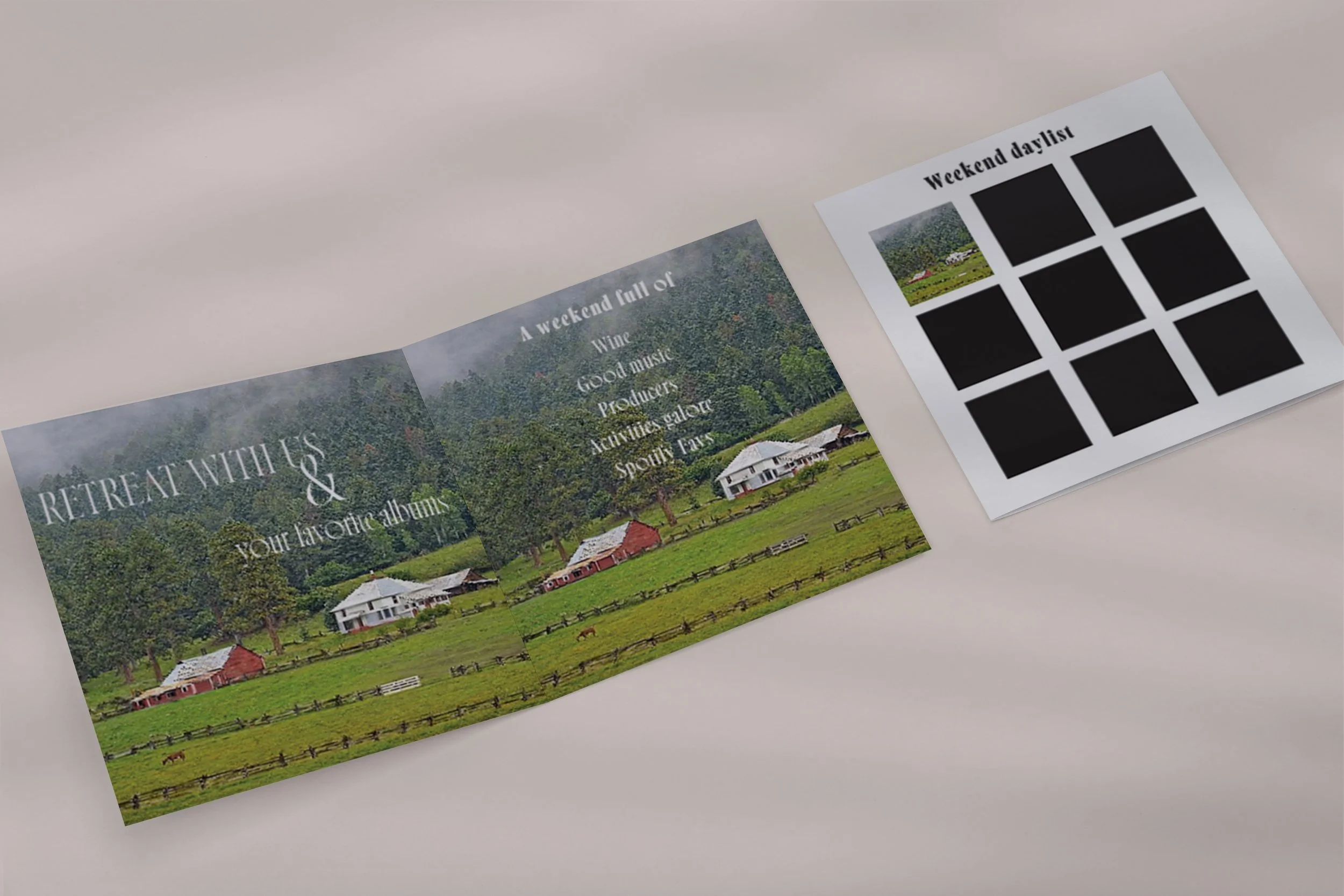 For the retreat invitation, I drew inspiration from the aesthetic of album covers, blending captivating visuals with carefully chosen words. The design evokes the feel of a camp sign, highlighting the various activities planned for the weekend in a playful yet organized manner. This project allowed me to combine my love for music with my design expertise, resulting in an invitation that is as inviting and memorable as the event itself.