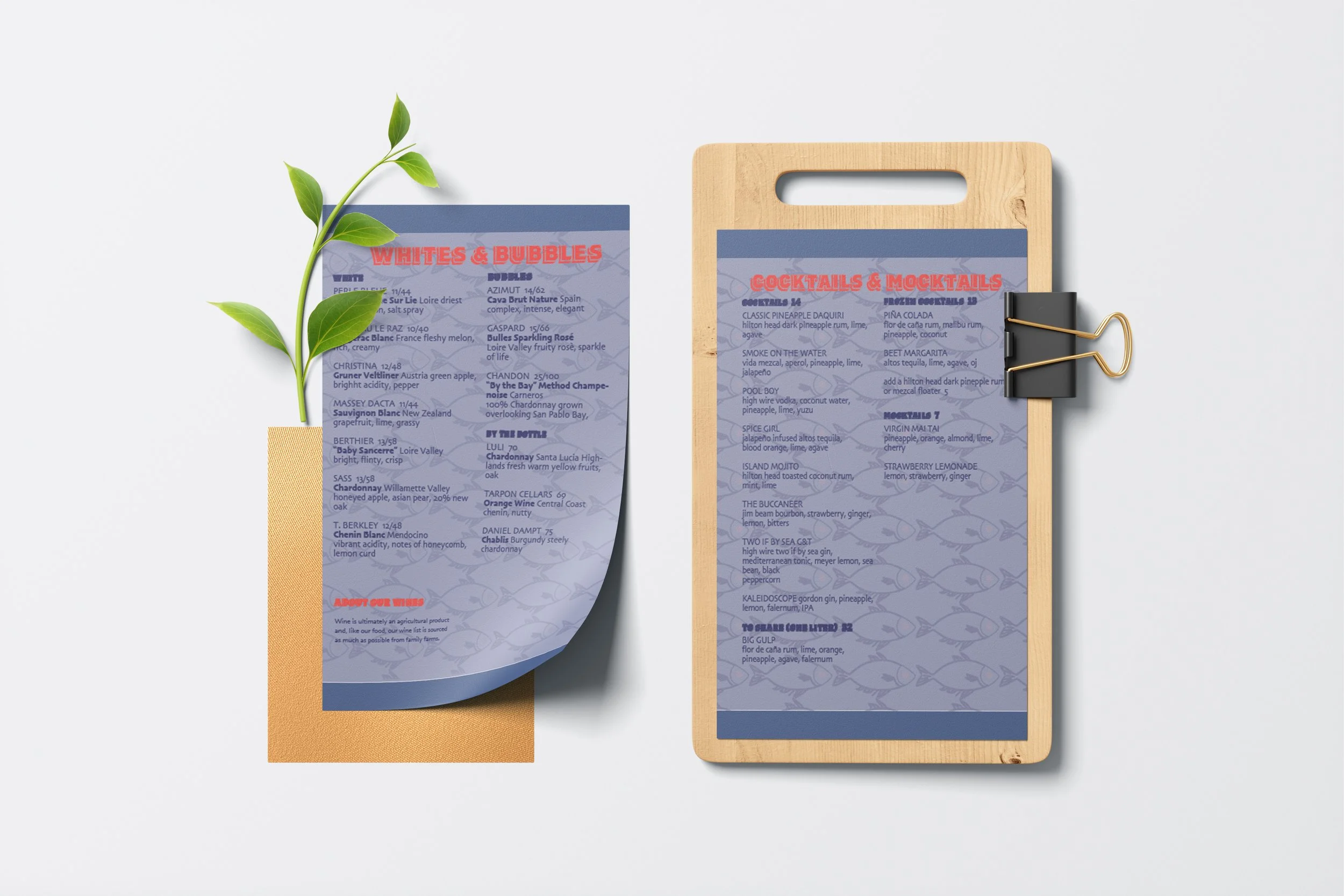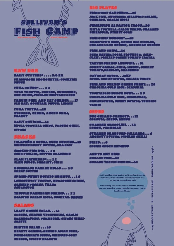 Using Adobe InDesign, I crafted a cohesive visual identity that captures the essence of Sullivan's Island Fish Camp. I was inspired by the fish concept, creating a logo to look like fish and bones and making sure to add a fish to every aspect of the pieces. The design incorporates oceanic colors and marine motifs, creating a fresh and inviting look that resonates with both locals and visitors.